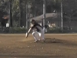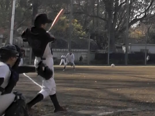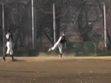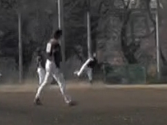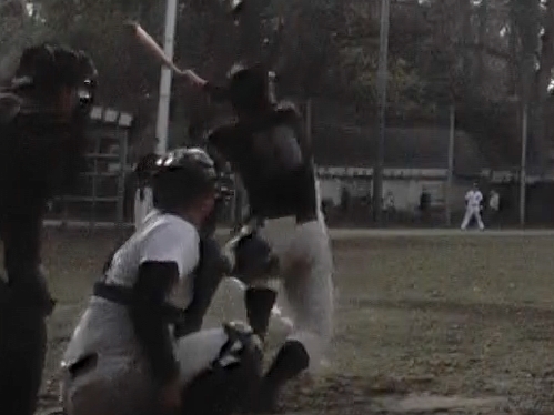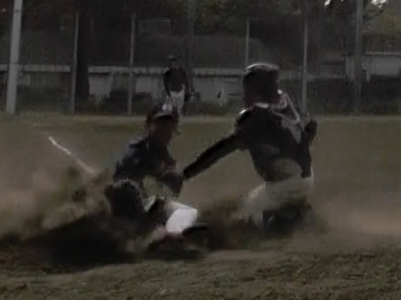 7回表、クローザーとしてマウンドに登ったのは矢野〔左〕。一死三塁から5番打者をサードゴロに打ち取るが、横井が腰を一番下までおろしながら、まさかの大トンネル。監督として最後のプレーがお恥ずかしいかぎり…。そして一死二塁から、次打者がセカンドのグラブをかすめるヒット。しかしバックアップに入った黄と小西が見事な中継でホームタッチアウト〔右〕。ここで時間切れ、最後は素晴らしいプレーでの締めとなった。