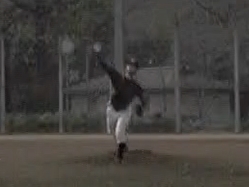 3回表、黄が驚異的な身体能力を見せる。先頭打者のセンターへのライナーをワンバンで掴むと矢のようなボールを一塁へ送り、センターゴロ〔左〕。これだけでも凄いのだが、二死後、またしてもセンターへ飛んだ打球を一塁へストライクで、なんと1イニングに2つのセンターゴロを達成〔右〕。これは南海ハーツ史上初の快挙に違いない。