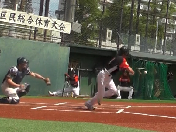 ハーツ打線は3回表に先頭の兵藤〔左〕がセンターへクリーンヒット。続く高松もきっちりミートするが、三塁手の右を抜くかと思われたライナーを好捕され、この回も無得点。5回表には、またもや兵藤が今度はレフトへヒット〔右〕でチャンスメイク。まさに大谷ばりの投げて良し、打って良し。しかしここも相手投手の老練な投球の前にハーツは得点できず。